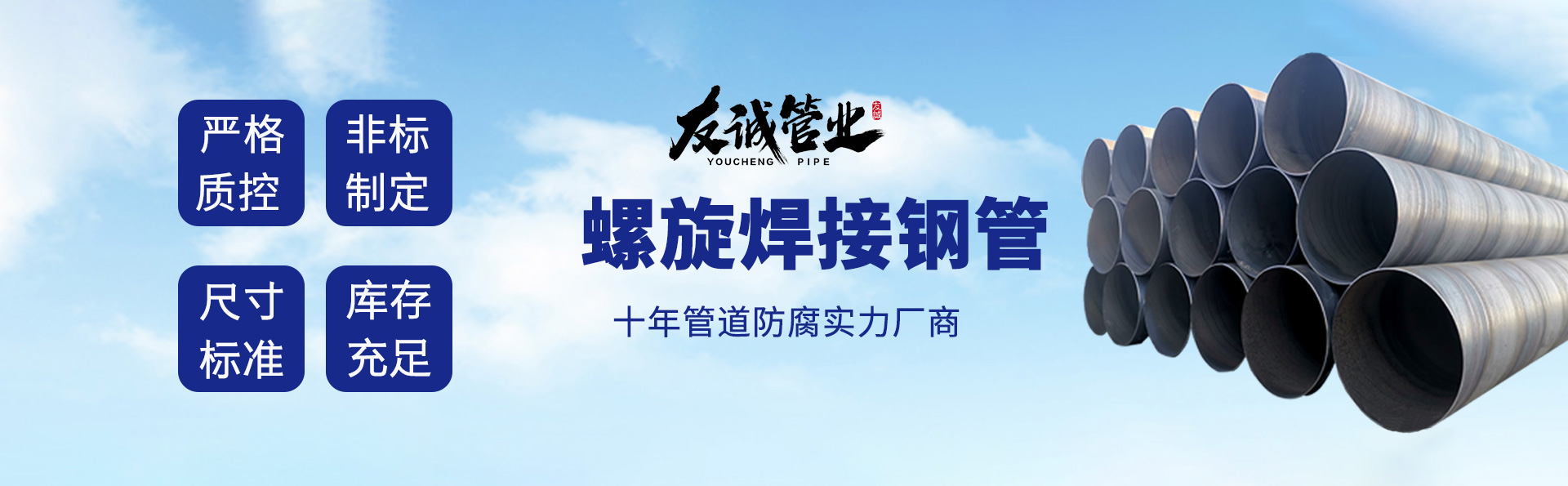 滄州友誠(chéng)管業(yè)有限公司是一家專(zhuān)業(yè)從事生產(chǎn)防腐涂塑管道及管件于一體的大型企業(yè)。公司注冊(cè)資金8600萬(wàn)元,位于中國(guó)管道生產(chǎn)基地—河北鹽山縣,近靠京滬高速、榮烏高速、黃石高速30公里,高鐵滄州西站40公里,天津國(guó)際機(jī)場(chǎng)、濟(jì)南遙墻機(jī)場(chǎng)150公里,為客戶(hù)來(lái)訪及業(yè)務(wù)發(fā)展提供了便利的交通條件。 鋼管系列:螺旋鋼管、無(wú)縫鋼管、ERW直縫焊管、JCOE埋弧焊直縫鋼管、熱鍍鋅鋼管。 涂塑系列:內(nèi)外涂塑鋼管、涂塑復(fù)合鋼…… 了解更多